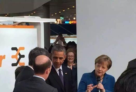 图为 德国总理安格拉默克尔和美国总统巴拉克奥巴马参观汉诺威展览会的魏德米勒展台